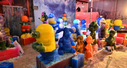 著名的人物、动漫、建筑等主题形象是此次冰雕艺术展设计阶段的重点,注重冰雕作品情境性、 故事性的塑造,在留有足够安全通道的基础上,充分合理的利用展览空间,对冰雕作品采用黑色不透光布幔进行垂直空间分割,配合顶部彩色LED射灯,形成强烈 的空间感,增强环境氛围。冰雕作品的精细化程度可以说是在华东地区是高的。